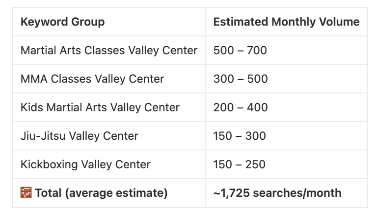 → 1,725 × 0.80 = 1,380 local-intent searches/month